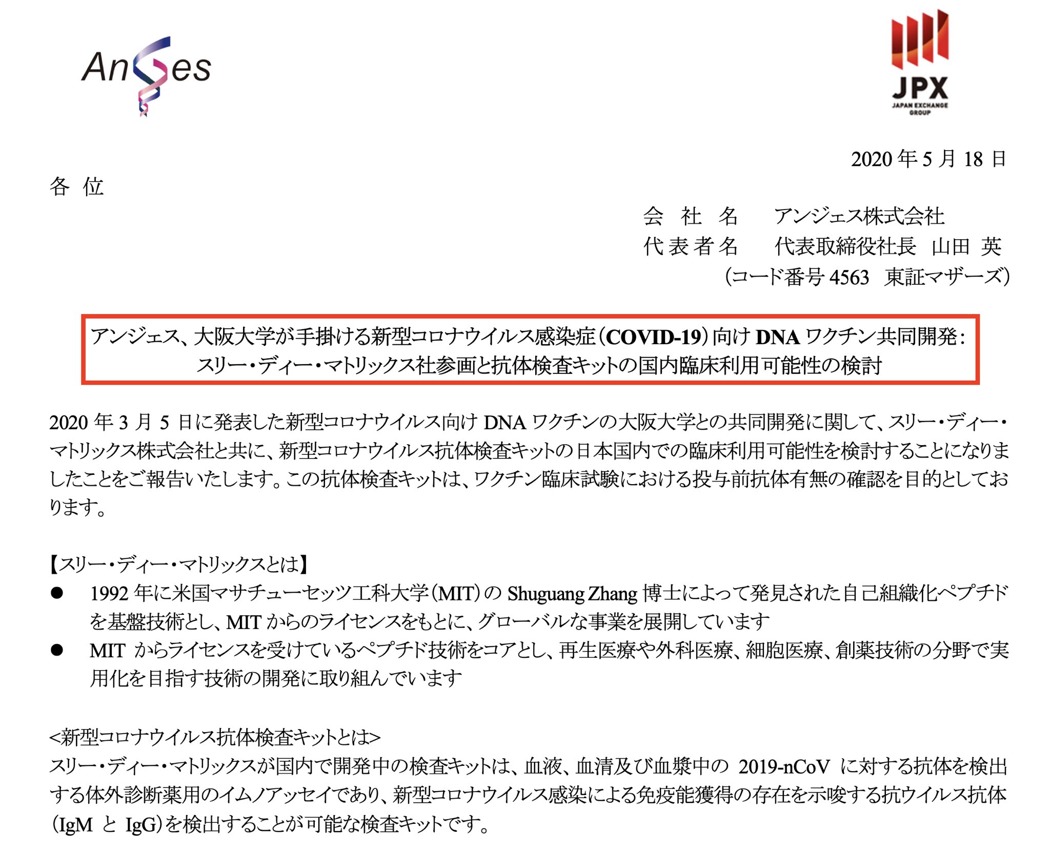 アンジェス 4563 アンジェス 大阪大学が手掛ける新型コロナウイルス感染症向けdnaワクチン共同開発 スリー ディー マトリックス社参画のお知らせ 2020年5月18日 適時開示 日経会社情報digital 日本経済新聞